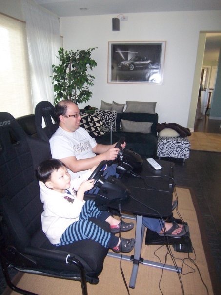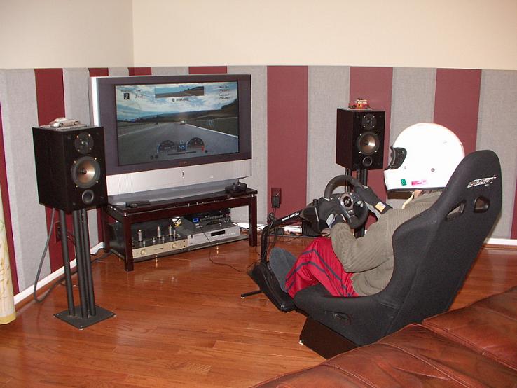 This is Toby and Kenny setup circa 2006: Playseat; Logitech Driving Force Wheel; Sony SXRD HDTV; No surround sound, but with hi-end audio system complete with a tube amp!