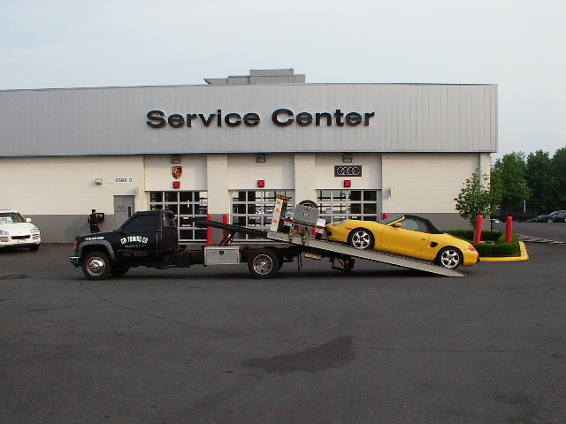 Our worries were unwarranted. The insurance company covered the $3000 tow bill to DC. (We had to pay extra for the trailer though.) We rode three-abreast in the cab of the tow truck. Ten hours later, we dropped Dirty Molly off at the local Porsche dealer lot.