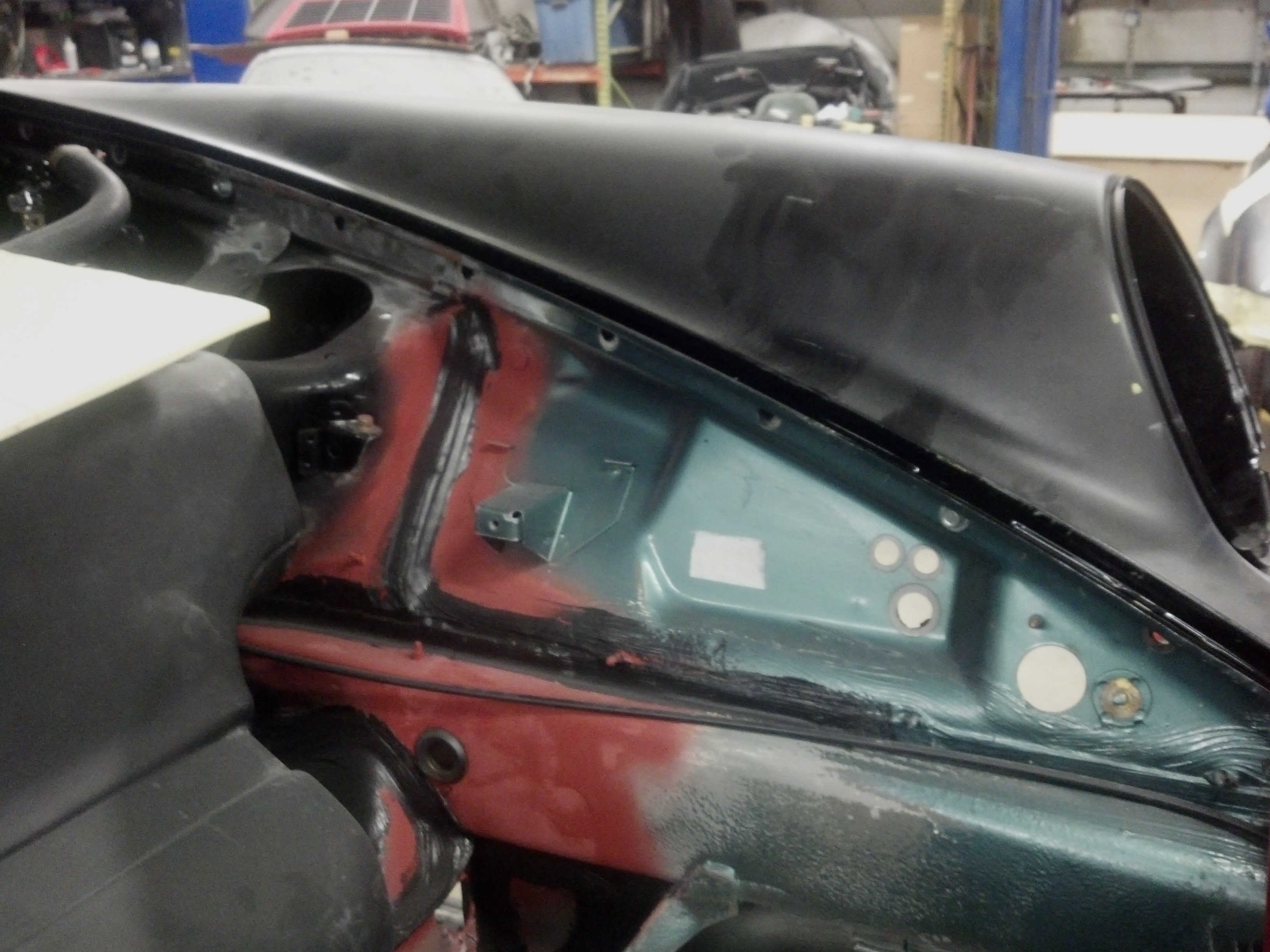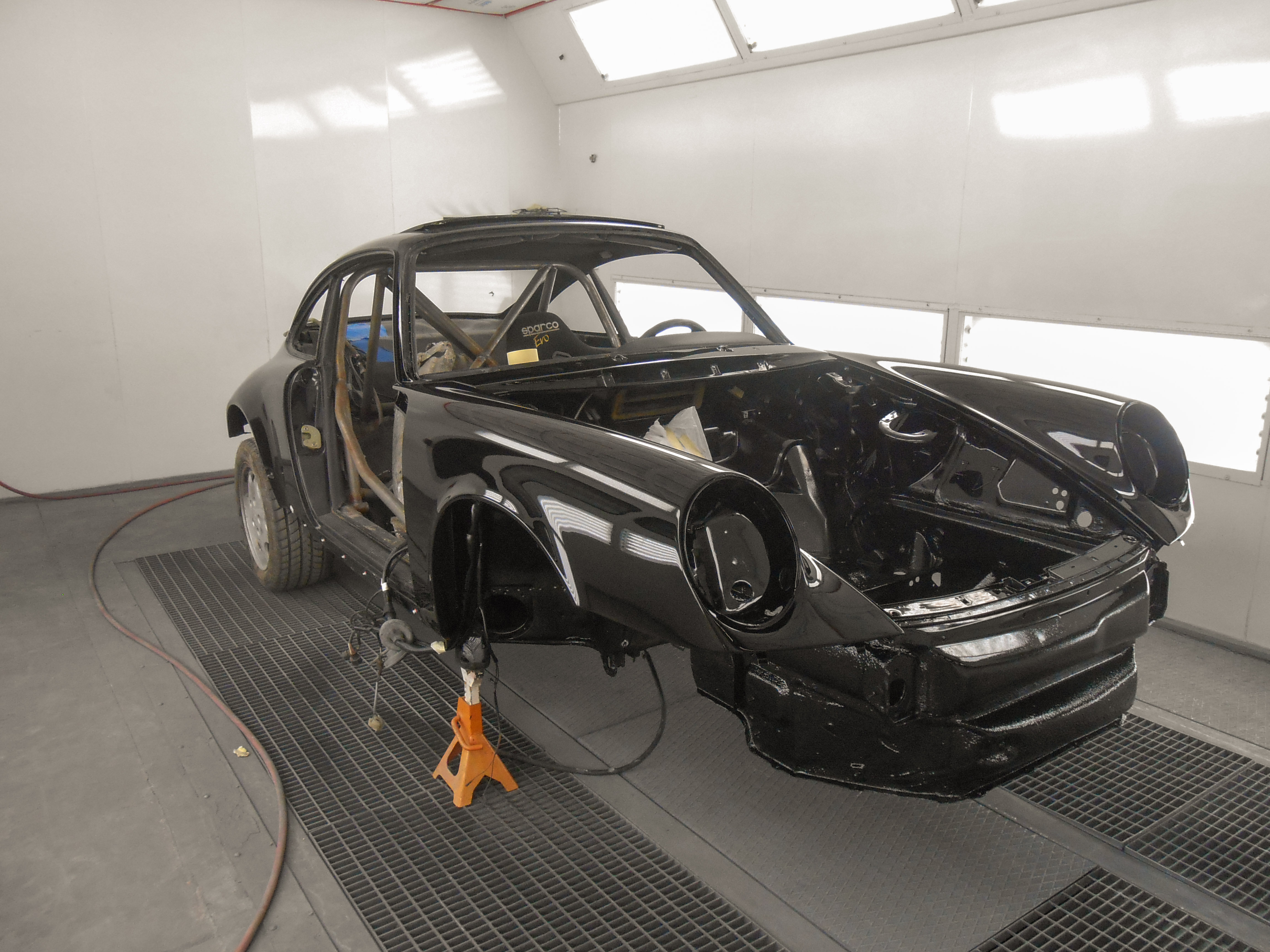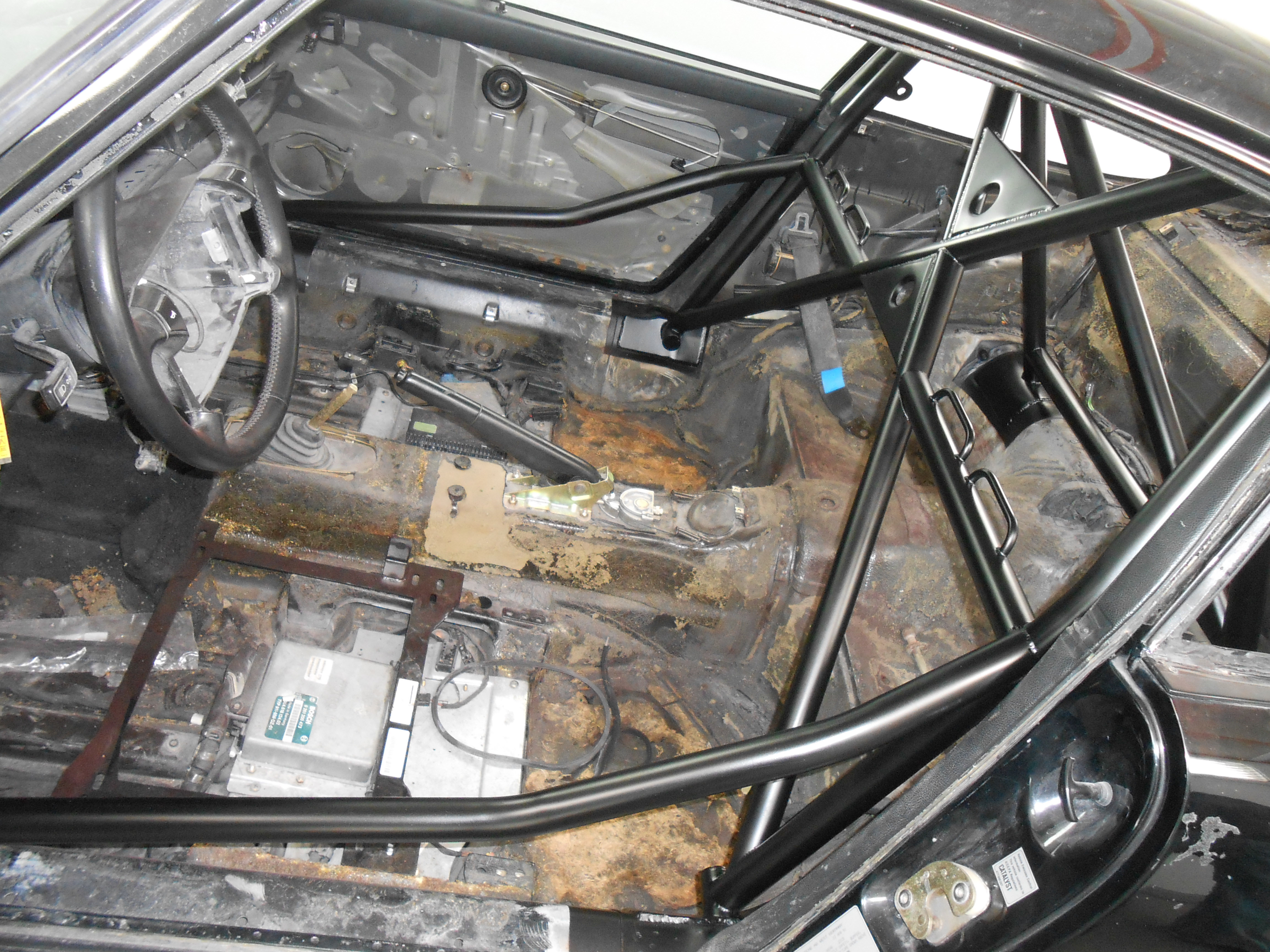 Jack straightened the frame and replaced the front “clip” (basically the whole section of the body in front of the shock towers) off a green donor. It was an ordeal to find a good front clip… the first two were not straight and were returned before finally finding a good one. A lightweight chromoly half cage (modeled after the latest FIA spec / 997 Cup) was added while the frame was tensioned on the Celette jig.