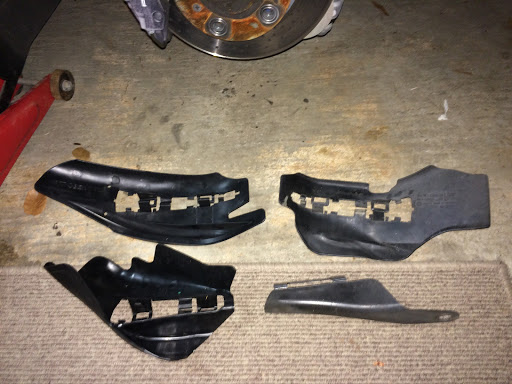 A quick comparison of the upgraded (left) vs stock (right) brake ducts. Not sure if there is any actual performance improvement, but for less than $100 this upgrade is a no-brainier.