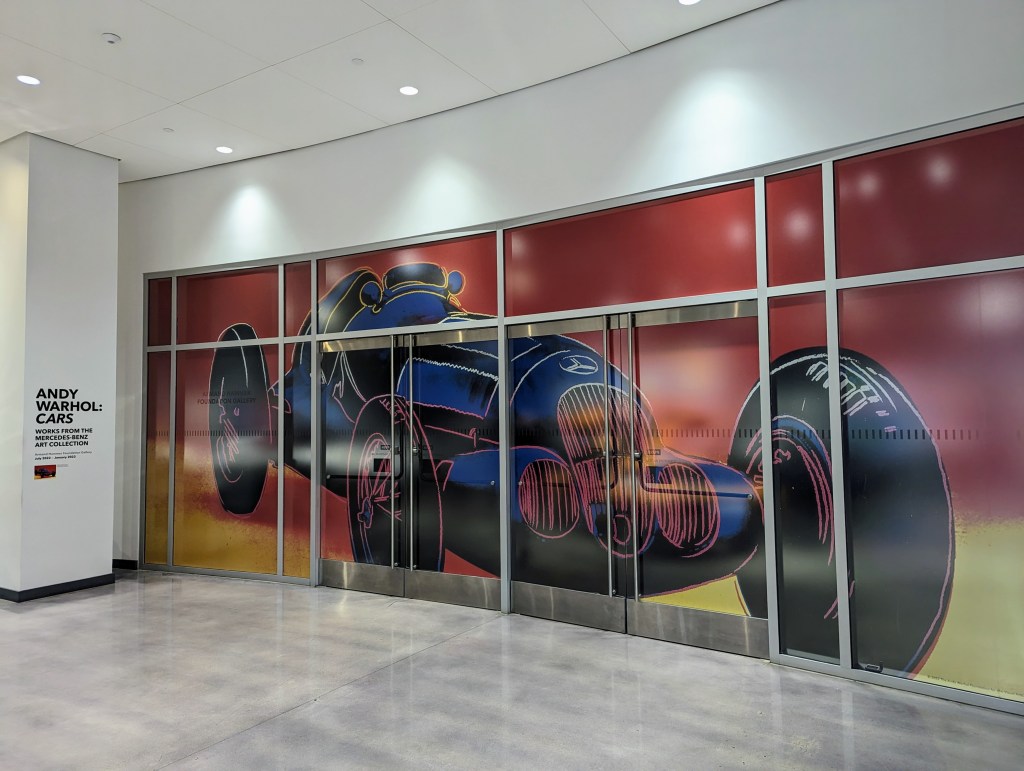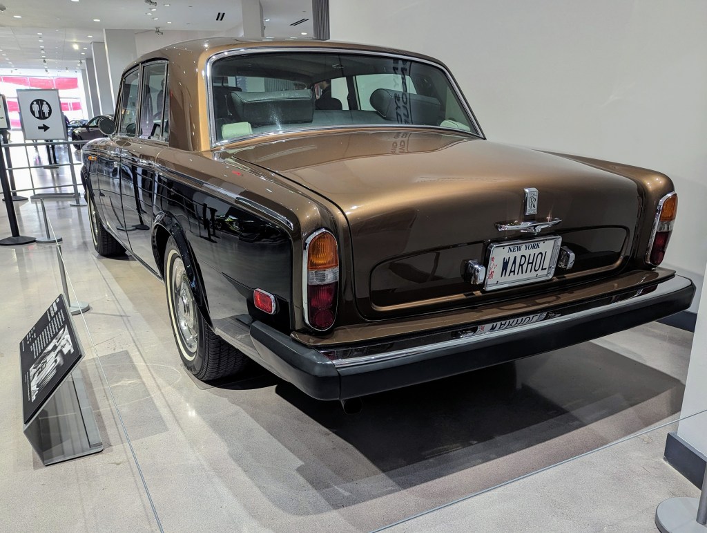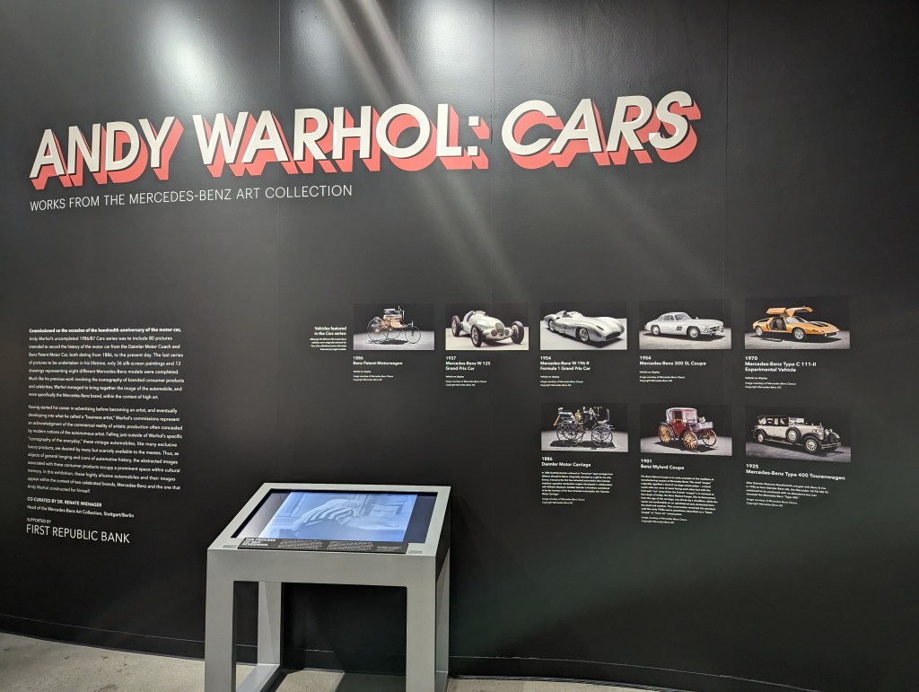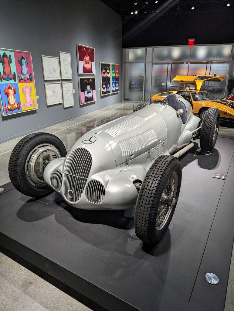 Last but certainly not least was the Mercedes / Andy Warhol Art Collection, which featured Toby ‘s other favorite, the 300SL Gullwing. It also featured the W196 R F1 that powered Juan-Manuel Fangio to 1954 and 1955 World Champion, and Andy Warhol’s own Rolls Royce (not Mercedes). And did I mention the art on the wall?